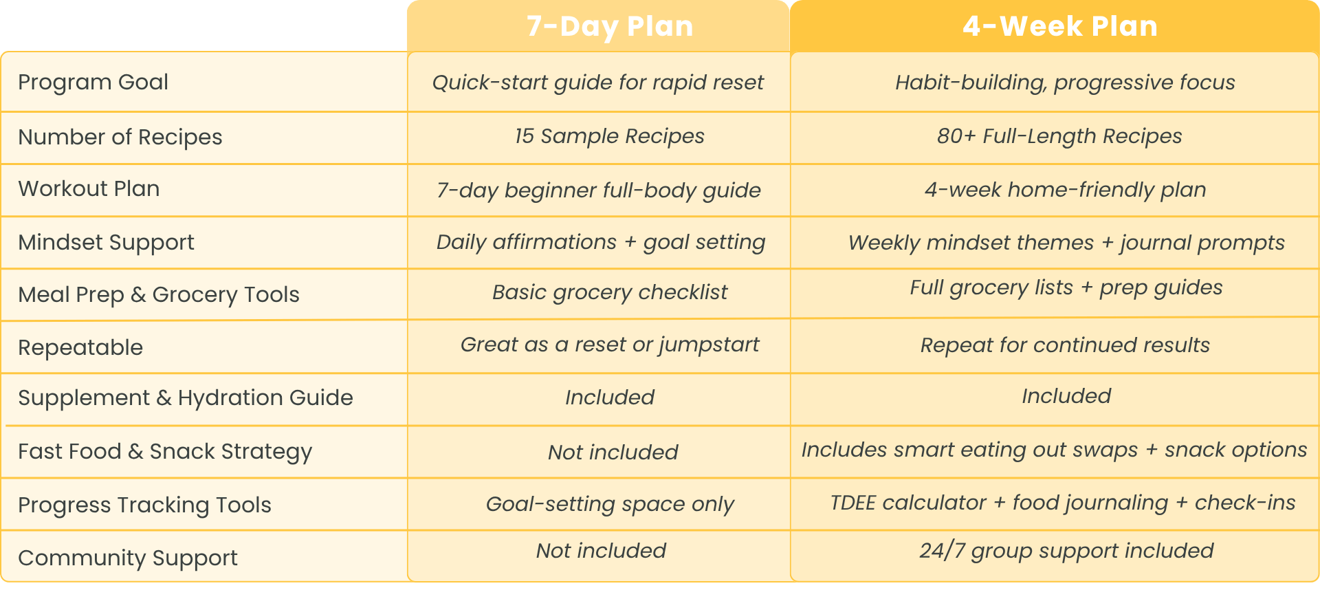 Yes! As a 4-Week Plan member, you’ll get access to a 24/7 private support group (available with the Classic and Vegan versions). You’ll be able to connect with others on the same journey, share progress, ask questions, and get encouragement along the way.